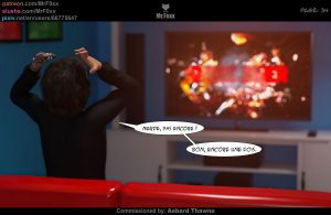 Kevin et David jouent aux jeux vidéo dans la chambre de Kevin. David, déterminé à gagner la prochaine fois, profite de l’absence temporaire de Kevin, parti aux toilettes, pour s’entraîner davantage. L’amitié et la compétition amicale rythment leur après-midi ludique.